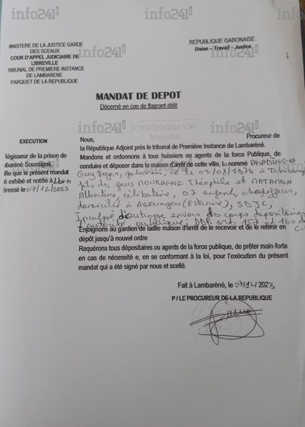 Selon le mandat de dépôt délivré par la procureure adjointe du tribunal de première instance de Lambaréné, ce père de famille aurait commis le crime de lèse-majesté en interpellant le président de la transition sur la persistance du racket opéré par les gendarmes. Il a ainsi été inculpé pour « outrage envers des corps dépositaires d’autorité publique », simplement pour avoir exprimé à voix haute ses interrogations sur le fait de savoir si le racket pratiqué par les forces de l’ordre servait à payer la dette extérieure du Gabon.