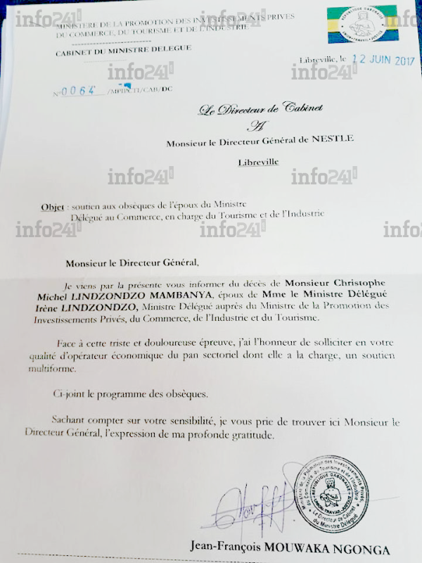 Dans cette lettre officielle datée de ce lundi 12 juin que s’est procurée Info241, Jean-François Mouwaka Ngonga demande expressément aux opérateurs économiques un « soutien multiforme » pour assister la veuve-ministre si cruellement éplorée. Comptant sur leur « sensibilité » face à ce décès, le premier collaborateur de cette ministre de la République gabonaise, entend user de sa position pour récolter toute forme d’aide y compris la générosité financière d’entreprises opérant dans son secteur ministériel.