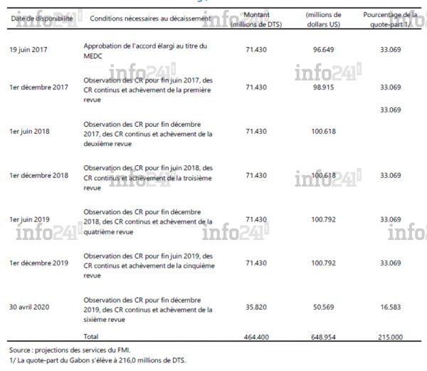 La dernière revue des engagements du Gabon a donné lieu à un satisfecit du FMI : La revue effectuée en décembre 2017 a été concluante et a autorisé les décaissements prévus initialement. Le rapport de cette revue est consultable en ligne : ici. Le Directeur général adjoint du FMI y déclare notamment : « Les résultats obtenus par le Gabon dans le cadre du programme ont été globalement satisfaisants ».
