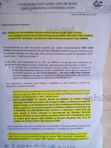 Dans le procès verbal de la CAB qui a été transmis à Info241, la CAB indique que ce n’est ni l’individu Taylor Mabika ni l’organisation WBC qui est sanctionnée.