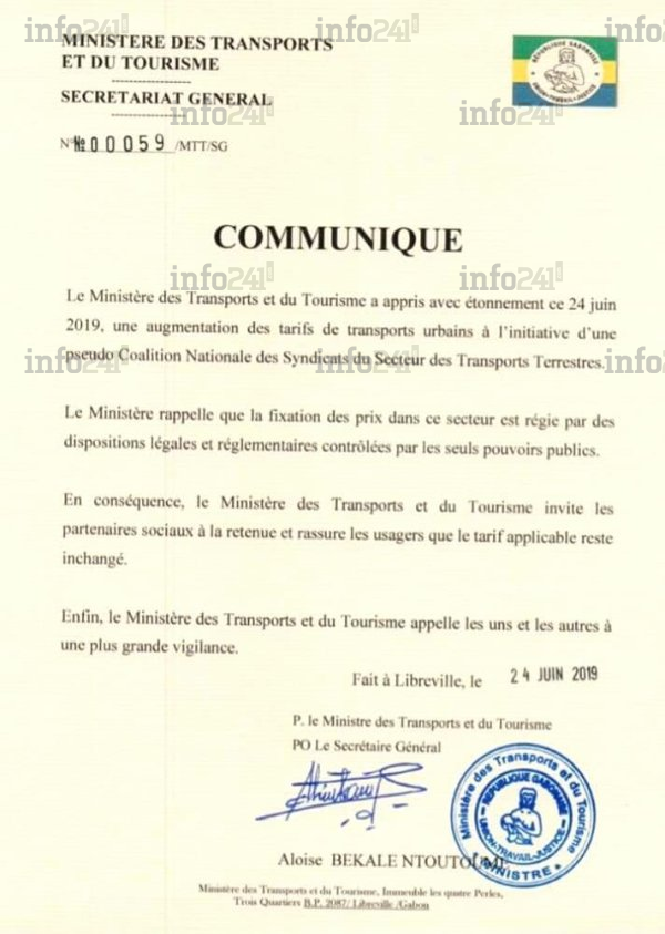 Pourtant annoncé depuis samedi, date de l’assemblée générale de la Conasytra, c’est finalement ce lundi après-midi que le ministère des Transports a daigné réagir à cette énième augmentation qui fragilise encore plus le pouvoir d’achat des ménages gabonais. Dans son communiqué, le ministère qui qualifie la Conasytra de « pseudo coalition » de transporteurs, ne cache pas son agacement face à cette situation explosive.