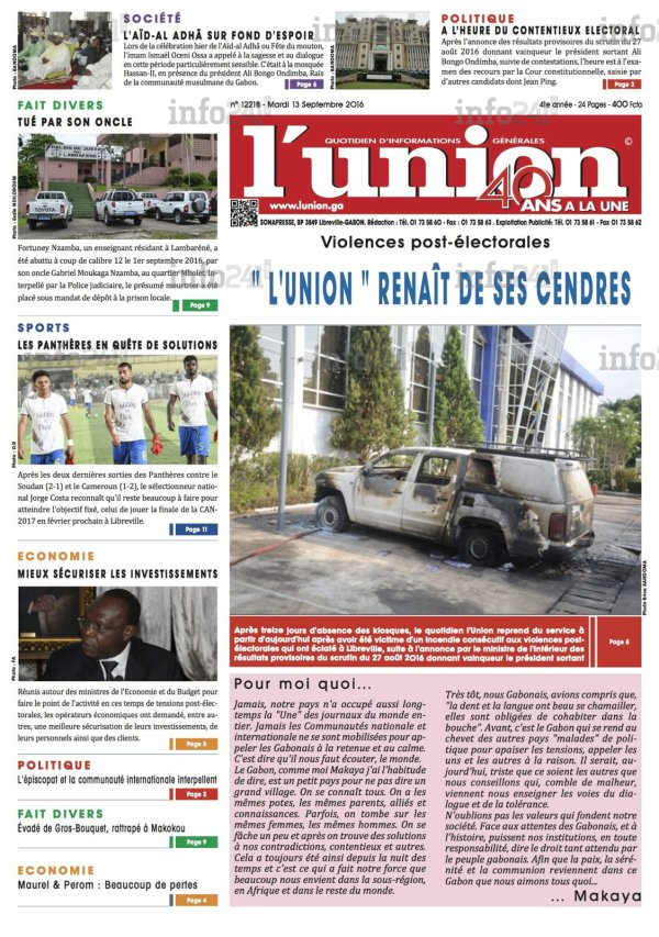 L’Union est de nouveau de retour en kiosque après 13 jours d’absence. Le quotidien pro-gouvernemental avait été la cible, selon les autorités gabonaises, de manifestants le 31 août dernier après l’annonce des résultats donnant vainqueur le président sortant Ali Bongo.
