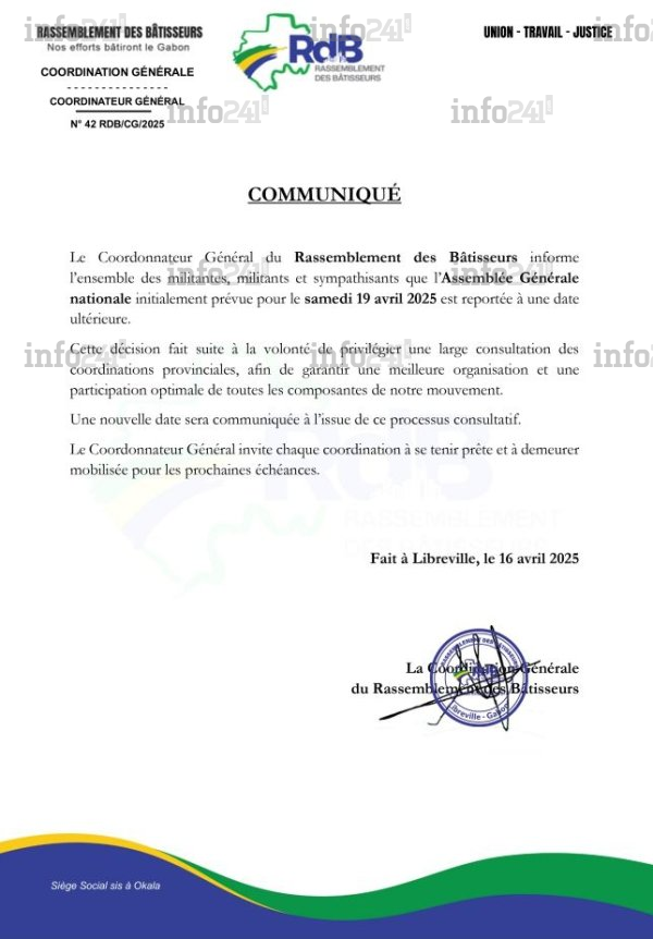 Le Rassemblement des Bâtisseurs (RdB), plateforme politique ayant porté la candidature du général-président Brice Clotaire Oligui Nguema à la présidentielle gabonaise du 12 avril, a annoncé ce mercredi le report de son assemblée générale nationale initialement prévue le samedi 19 avril. Selon un communiqué signé de son coordonnateur général Anges Kevin Nzigou, cette décision vise à «  privilégier une large consultation des coordinations provinciales » afin d’aboutir à une meilleure organisation et inclusion des composantes du mouvement.