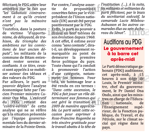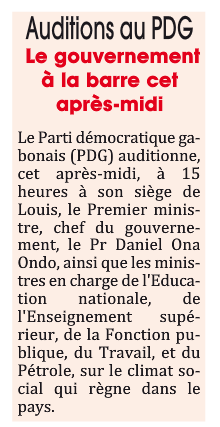 Bourde, vous avez dit bourde ? Un curieux encart en page 3 du quotidien gabonais l’Union n°11772 de ce jeudi 5 mars 2015. Dans cette note d’agenda, le quotidien pro-gouvernemental informe le public que des auditions du Premier ministre et de certains ministres du gouvernement gabonais, se tiendront cet après-midi à 15h...au siège du Parti démocratique gabonais (PDG, au pouvoir) situé à Louis.