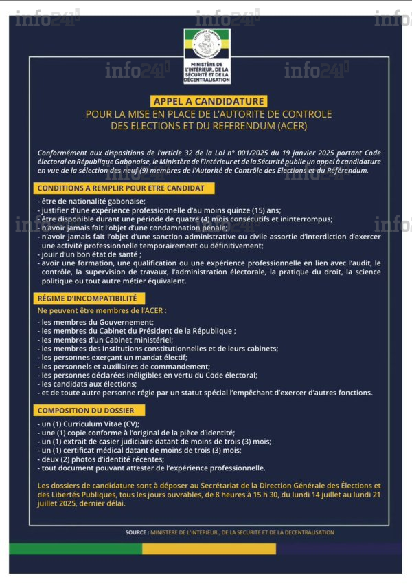Pour candidater, les postulants devront remplir des conditions strictes. Il est notamment exigé d’« être de nationalité gabonaise », de « justifier d’une expérience professionnelle d’au moins quinze (15) ans » et d’« être disponible durant une période de quatre (4) mois consécutifs et ininterrompus ». De plus, les candidats ne doivent « jamais avoir fait l’objet d’une condamnation pénale » ni d’une « sanction administrative ou civile assortie d’interdiction d’exercer une activité professionnelle ».