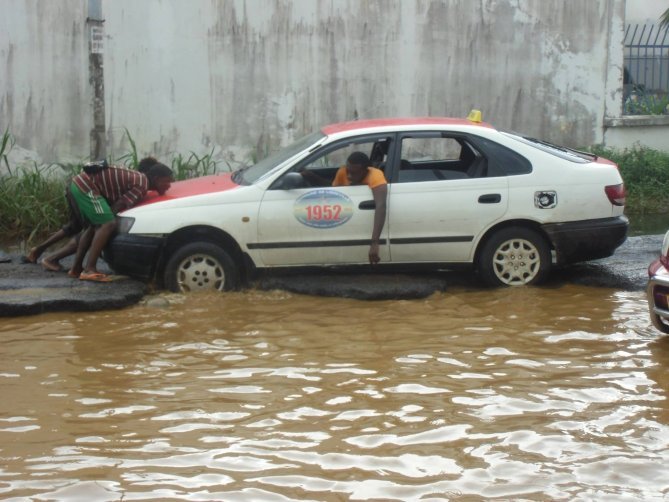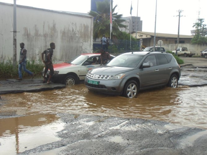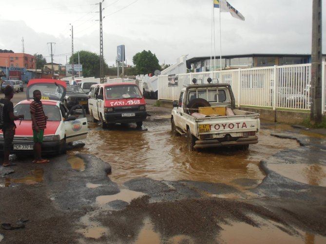 En images, le calvaire des usagers qui éprouvent toutes les peines du monde à circuler dans la zone industrielle d’Oloumi à Libreville en raison de la dégradation de la voie publique où nids de poule ont cédé le flanc à des îlots routiers grâce à l’arrivée des pluies dans la capitale gabonaise. Images @Walter Zogho