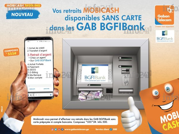 Le retrait Mobicash via la plateforme GAB BGFIBank, est un service innovant qui permettra aux abonnées Gabon Telecom disposant d’un compte Mobicash (portefeuille électronique) de retirer de l’argent en liquide sans carte, dans les distributeurs automatiques de l’ensemble du réseau GAB de BGFIBank Gabon, en toute sécurité.