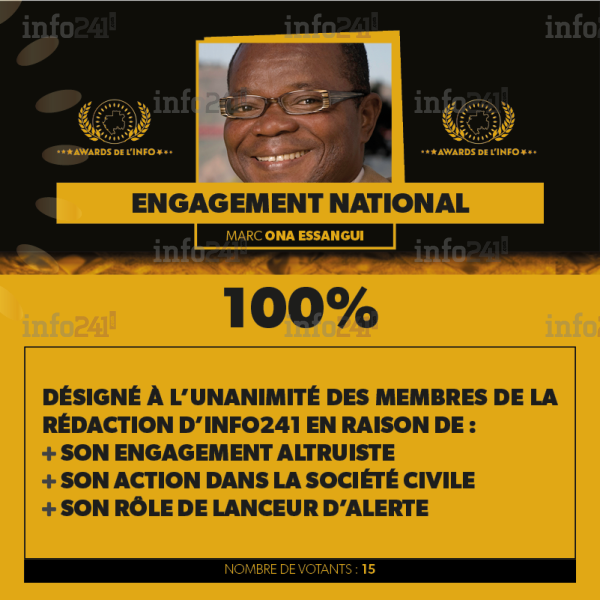 Le prix de l’engagement national sacrant une personnalité gabonaise pour son engagement a été décerné à Marc Ona Essangui à l’unanimité des membres du Comité des Awards de l’info. Le prix Goldan a été préféré pour son altruisme, son engagement dans la société civile et son important rôle de lanceur d’alerte.