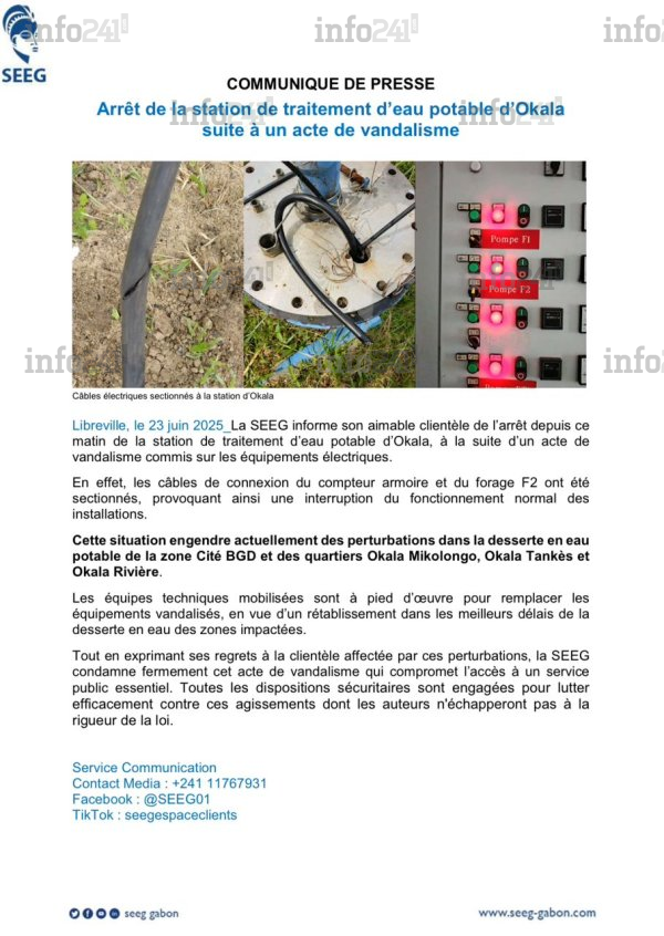 La SEEG indique avoir immédiatement mobilisé ses équipes pour procéder au remplacement des équipements endommagés. Les travaux sont en cours afin de rétablir la desserte en eau potable « dans les meilleurs délais » pour les zones impactées.
