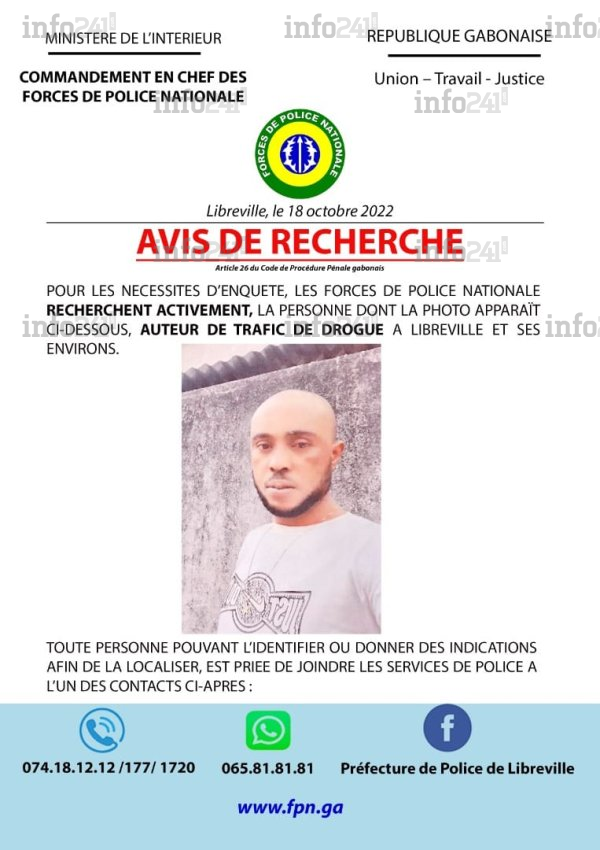 La préfecture de police de Libreville a lancé ce mardi, un avis de recherche pour mettre la main au collet d’un trafiquant de drogue présumé. La personne recherchée l’est pour trafic de drogue à Libreville et ses environs. « Pour des nécessités d’enquêtes, les forces de police nationale recherchent activement la personne dont la photo apparaît ci-dessous, auteur de trafic de drogue à Libreville et ses environs », renseigne le communiqué de police daté de ce 18 octobre.