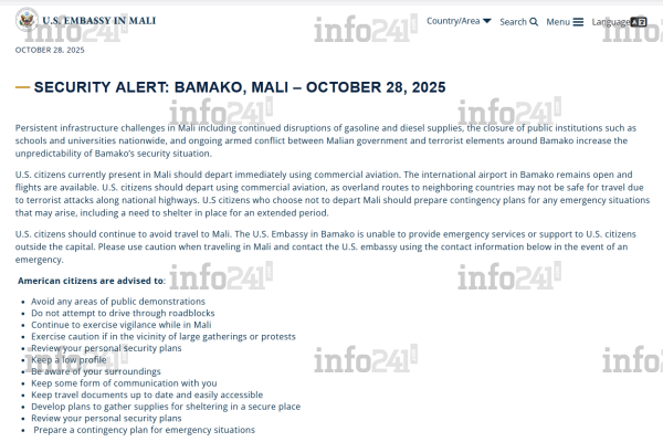 Selon la même source, les ressortissants américains sont invités à quitter le pays par voie aérienne, le vols commerciaux restant encore disponibles à l’aéroport international de Bamako. L’ambassade déconseille strictement tout déplacement par voie terrestre, jugée trop dangereuse en raison des attaques récurrentes contre les convois et les routes nationales. Elle précise en outre qu’elle ne peut garantir aucun service d’assistance en dehors de la capitale.