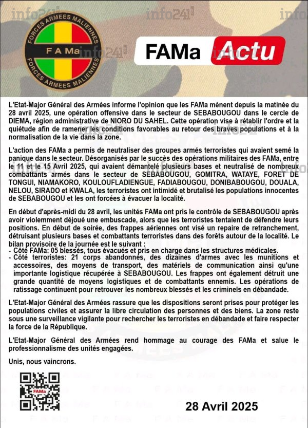 Selon le communiqué, les unités des FAMA ont pris le contrôle total de Sébabougou le 28 avril, après avoir repoussé une embuscade tendue par les terroristes. Les frappes aériennes ont joué un rôle déterminant, détruisant plusieurs bases et combattants terroristes retranchés dans les forêts environnantes. Le bilan provisoire fait état de 5 blessés du côté des FAMA, tous évacués et pris en charge, tandis que 21 corps de terroristes ont été abandonnés sur place. Une importante quantité de matériel, incluant des armes, des munitions, des moyens de transport et des équipements de communication, a été récupérée.