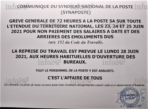 À l’issue d’une assemblée générale tenue ce lundi à l’esplanade de la Poste du centre-ville de Libreville, les postiers ont voté à l’unanimité l’observation d’une grève d’avertissement de 72h à compter de ce mercredi 23 juin 2021 pour attirer une fois de plus l’attention des autorités sur les difficultés qu’ils traversent chaque mois et ce depuis 2015.