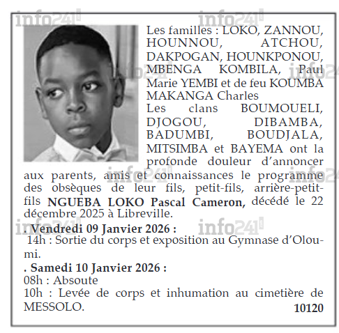 L’ultime adieu est programmé pour demain, samedi 10 janvier 2026. Après une absoute prévue à 8 heures, la levée du corps aura lieu à 10 heures pour conduire le jeune Cameron vers sa dernière demeure. C’est au cimetière de Messolo que l’enfant sera inhumé, refermant ainsi, dans la douleur et le recueillement, une affaire qui aura profondément marqué cette fin d’année au Gabon.