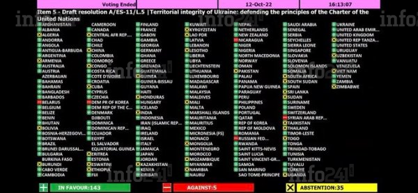 Le Gabon qui préside ce mois d’octobre le conseil de sécurité de l’ONU, a voté ce mercredi contre l’annexion de 4 régions ukrainiennes par la Russie. Le texte de la résolution intitulé « Intégrité territoriale de l’Ukraine : défense des principes consacrés par la Charte des Nations Unies », a été adopté par 143 voix pour, 5 contre et 35 absentions. Ce vote a surtout permis d’entrevoir les soutiens russes au sein de l’assemblée générale des Nations qui sont potentiels de 40 voix dont plusieurs états africains.