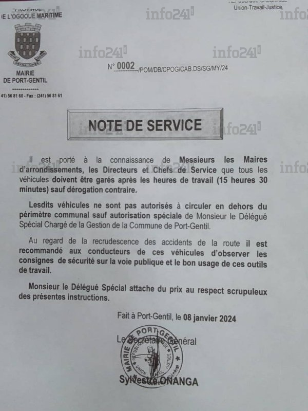 Selon la note de service datée du 8 janvier 2024, tous les véhicules doivent désormais être garés après 15 heures 30, sauf dérogation contraire. De plus, il est strictement interdit à ces véhicules de circuler en dehors du périmètre communal, à moins d’obtenir une autorisation spéciale du délégué spécial choisi par les militaires du CTRI pour la gestion de la commune de Port-Gentil.