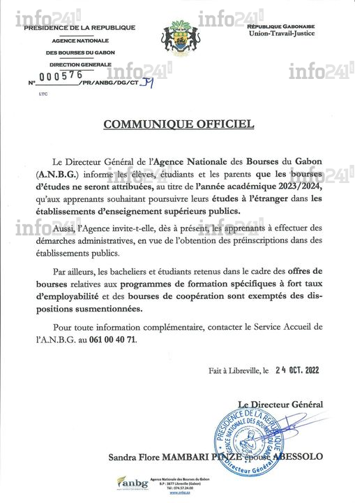 « Le Directeur Général de l’Agence nationale des bourses du Gabon (ANBG) informe les élèves, étudiants et les parents que les bourses d’études ne seront attribuées, au titre de rentrée académique 2023/2024, qu’aux apprenants souhaitant poursuivre leurs études à l’étranger dans les établissements d’enseignement supérieurs publics », a annoncé hier le communiqué officiel de l’agence.