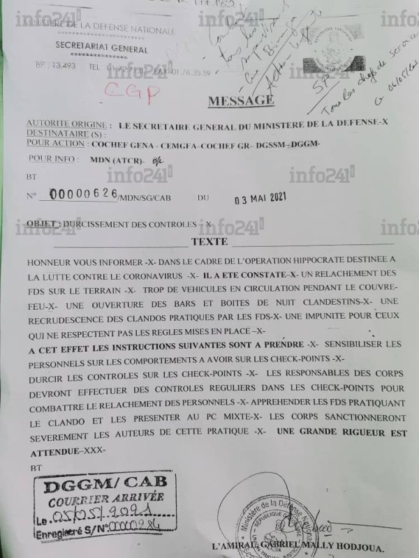 Dans ce message daté du 3 mai dont la rédaction d’Info241 a obtenu copie, on y apprend que la tutelle politique militaire est mécontente du relâchement observé durant les heures du couvre-feu Covid-19. « Trop de véhicules en circulation pendant le couvre-feu », relève l’amiral Gabriel Mally Hodjoua aux commandements aux hiérarques de la gendarmerie, de la police et de la garde républicaine.