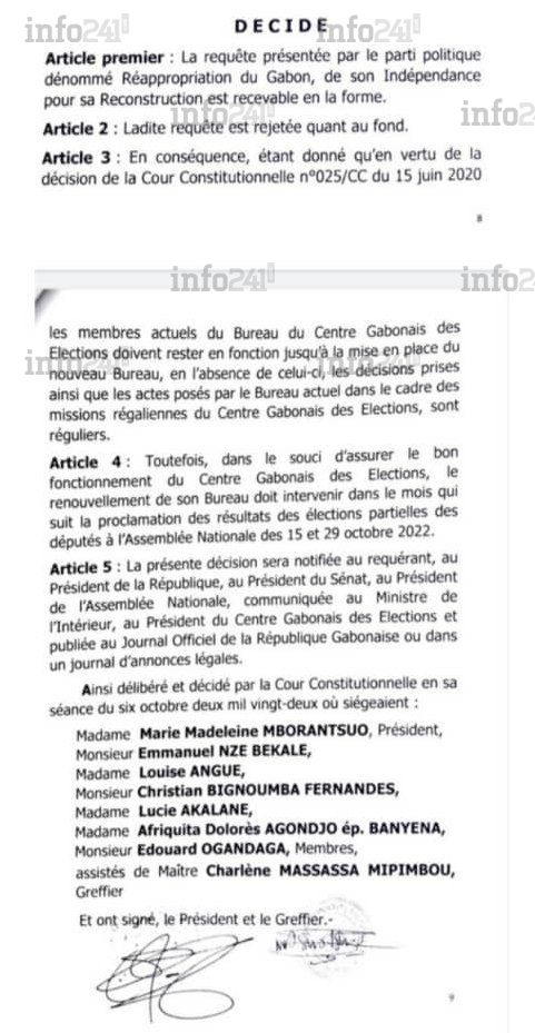 « Toutefois dans le souci d’assurer le bon fonctionnement du Centre gabonais des élections, le renouvellement de son bureau doit intervenir dans le mois qui suit la proclamation des résultats des élections partielles des députés à l’Assemblée nationale des 15 et 29 octobre 2022 », précise l’article 4 de la décision de la Cour constitutionnelle. Une victoire dont s’est réjouie REAGIR dans un communiqué.