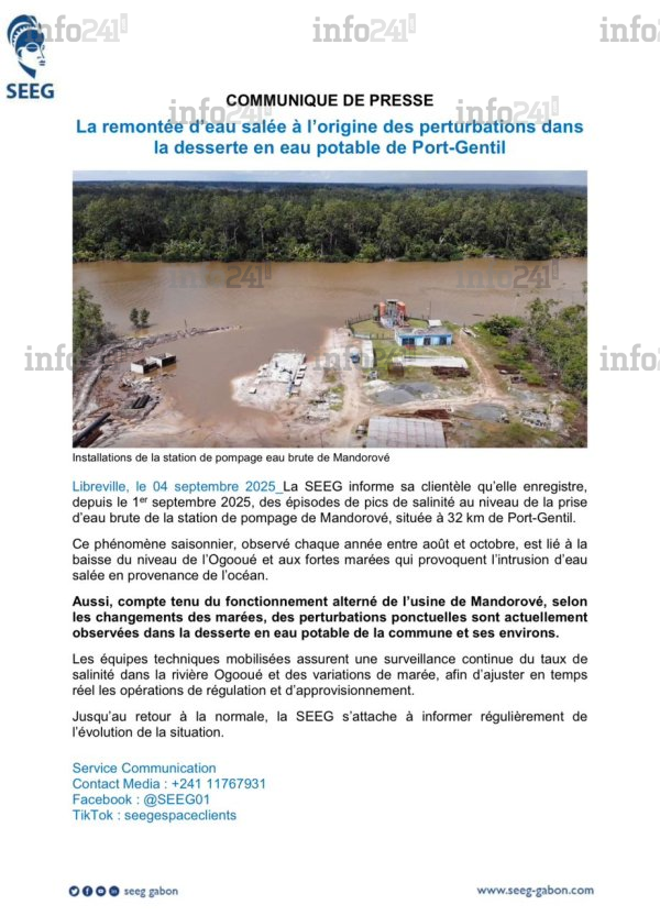 La SEEG précise que le fonctionnement de l’usine de Mandorové est adapté aux cycles des marées. Cependant, cette alternance engendre des perturbations ponctuelles de la desserte. « Des difficultés temporaires sont actuellement observées dans l’alimentation en eau potable de la commune et de ses environs  », souligne le communiqué parvenu à la rédaction d’Info241.