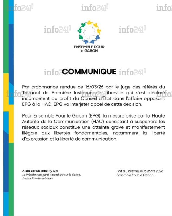 Loin de s’avouer vaincu par cette fin de non-recevoir procédurale, le camp d’Alain-Claude Bilie-By-Nze a immédiatement réagi. Le jour même du délibéré, le bureau du parti a publié un communiqué officiel pour contester cette interprétation juridique et annoncer la suite de sa stratégie. « Par ordonnance rendue ce 16/03/26 par le juge des référés du Tribunal de Première Instance de Libreville qui s’est déclaré incompétent au profit du Conseil d’Etat dans l’affaire opposant EPG à la HAC, EPG va interjeter appel de cette décision », indique sobrement la communication du mouvement.