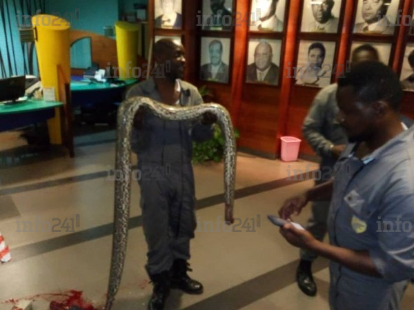 Grosse frayeur ce mercredi matin pour les salariés du siège social de la Caisse nationale de sécurité sociale (CNSS) du Gabon. Un python de plusieurs mètres a été retrouvé par des vigiles dans le hall de l’entreprise publique située à Libreville. Rapidement mis hors d’état de nuire, comme le montré ces clichés, le nuisible a tout de même plongé les employés et les riverains dans la stupeur. Que faisait-il là ? Y était-il depuis des lustres ? That is the question !