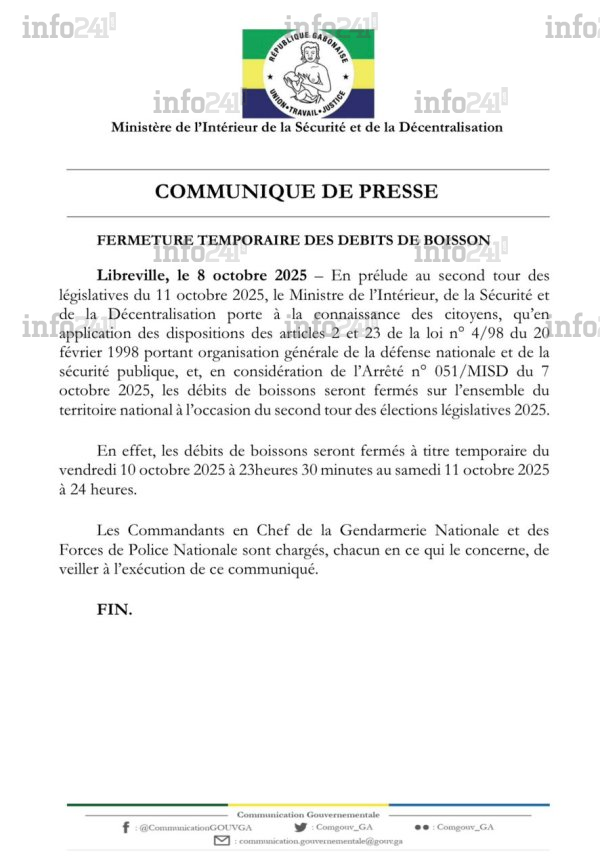 À l’approche du second tour des élections législatives prévu ce samedi 11 octobre, le ministère de l’Intérieur, de la Sécurité et de la Décentralisation a annoncé, dans un communiqué parvenu ce mercredi à Info241, la fermeture temporaire des débits de boissons sur l’ensemble du territoire gabonais. Cette décision controversée, similaire à celle prise lors du premier tour du 27 septembre, vise selon le gouvernement à garantir le calme et la sérénité du scrutin.