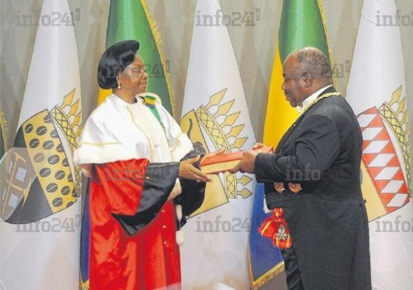 La précieuse présidente et belle-mère d’Ali Bongo, lui remettant la Constitution hier à Libreville