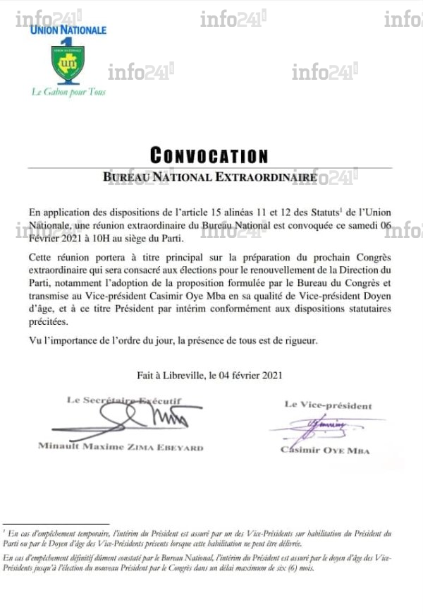 Cette réunion des membres du bureau national a été convoqué par le secrétaire exécutif Minault Maxime Zima Ebeyard et le vice-président Casimir Oyé Mba. Elle aura lieu ce samedi à 10h00 au siège du parti situé à l’Ancienne Sobraga à Libreville. Elle « portera à titre principal sur la préparation du prochain Congrès extraordinaire qui sera consacré aux élections pour le renouvellement de lu Direction du Parti », souligne le communiqué.