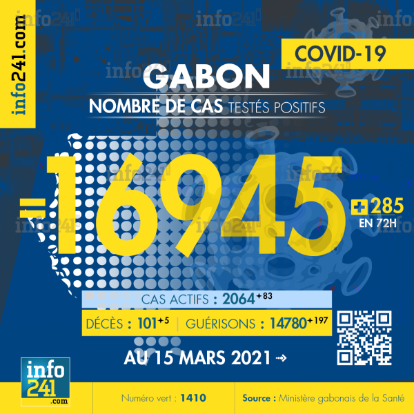 Bilan épidémiologique du Gabon au 15 mars 2021 : 285 nouveaux cas enregistrés en 72h dans l’Estuaire (203 cas), le Haut-Ogooué (74 cas), l’Ogooué-Lolo (5 cas), l’Ogooué-Maritime (2 cas) et le Moyen-Ogooué (1 cas). Il y a eu 5 nouveaux décès et 197 nouvelles guérisons.