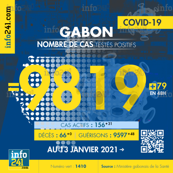 Bilan épidémiologique du Gabon au 13 janvier 2021 : 79 nouveaux cas enregistrés en 48h dans l’Estuaire (73 cas), l’Ogooué-Maritime (5 cas) et le Moyen-Ogooué ( 1 cas). Il y a eu aucun nouveau décès et 48 nouvelles guérisons.