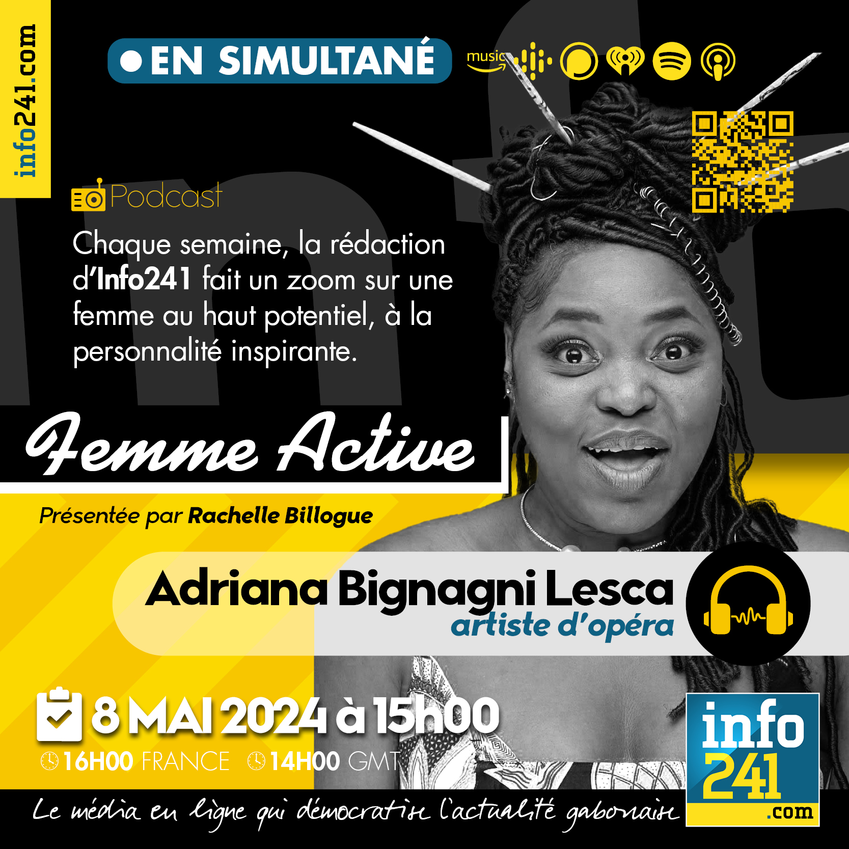 « Femme active » #15, l’émission qui met en lumière chaque semaine une femme au haut potentiel et à la personnalité inspirante. Notre invitée est Adriana Bignagni Lesca, artiste d’opéra et lyrique. Elle vit en Europe depuis 20 ans où elle pratique avec brio son art. Nous évoquerons avec elle son parcours et ses secrets de réussite.