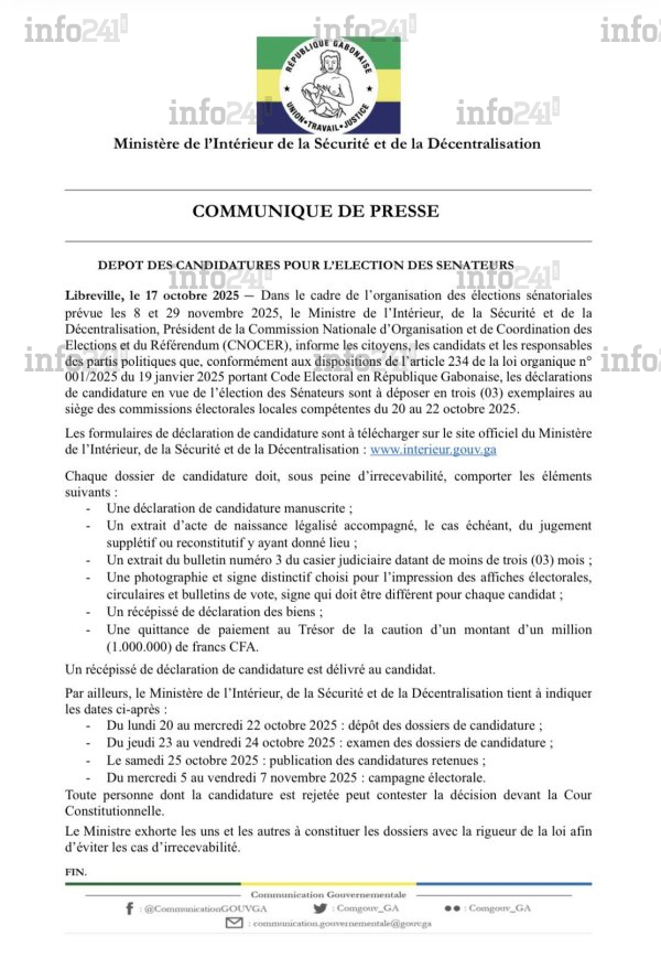 Selon le calendrier communiqué, les dossiers seront examinés du 23 au 24 octobre, avant la publication officielle des candidatures retenues le samedi 25 octobre. La campagne électorale, elle, s’ouvrira du 5 au 7 novembre. Une chronologie resserrée qui traduit la volonté du ministère de maintenir le cap sur les échéances sénatoriales, malgré un climat politique encore marqué par les contestations issues des législatives et locales.