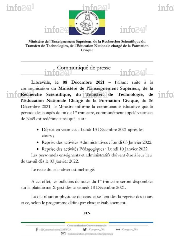 C’est ce que martèle un communiqué du ministère de l’Education nationale dévoilée ce vendredi soir. Selon ce nouveau réaménagement, la reprise des cours reste maintenue au 3 janvier pour le second trimestre. Par ailleurs, « les bulletins de notes du 1 » trimestre seront disponibles sur la plateforme X-gest dès le samedi 18 décembre 2021. La distribution physique de ceux-ci se fera dès la reprise des cours et ce, selon le programme défini par chaque établissement", précise le communiqué officiel.