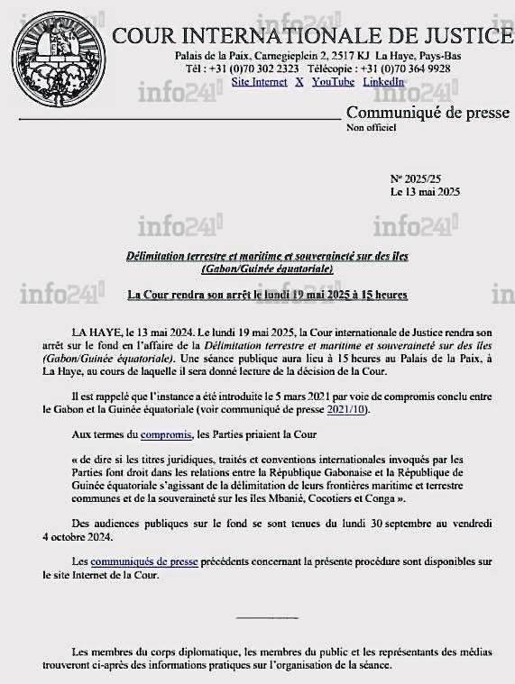 La Cour internationale de Justice (CIJ) rendra son arrêt dans l’affaire opposant le Gabon à la Guinée équatoriale sur leur différend frontalier terrestre et maritime, ainsi que sur la souveraineté de plusieurs îles, ce lundi 19 mai à 15h, selon un communiqué publié mardi par l’institution. Cette audience publique intervient après les plaidoiries tenues du 30 septembre au 4 octobre 2024.