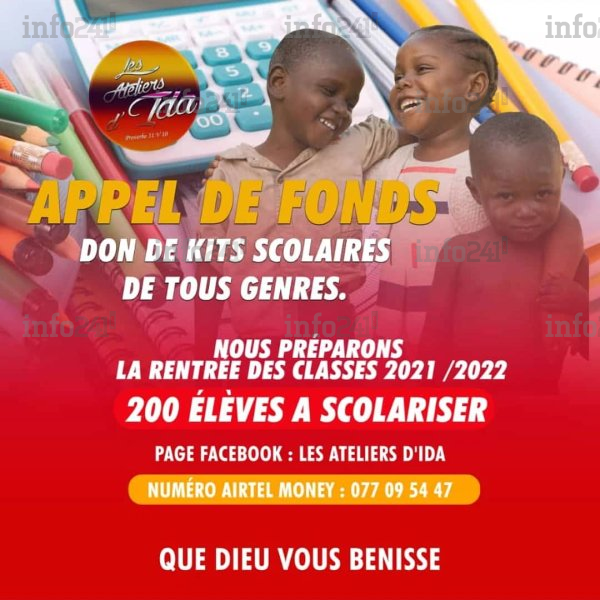 L’ONG chrétienne « Les Ateliers d’Ida », fondée par la diva du gospel gabonais, Ida Moulacka, lancera le 2 septembre prochain à Libreville, Ntoum et Port-Gentil, un appel aux dons pour l’achat des kits scolaires aux bénéfices des orphelinats, indique une note d’information de l’association parvenue à la rédaction d’Info241.