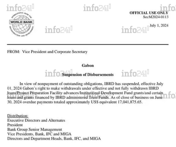 Cette suspension représente un coup dur pour le Gabon, dont les financements de développement sont cruciaux pour divers projets nationaux. Les autorités gabonaises sont désormais confrontées à la tâche urgente de régler ces arriérés pour rétablir l’accès aux fonds vitaux pour le développement économique et social du pays. La lettre confidentielle dont s’est procurée Info241, classifiée sous « USAGE OFFICIEL UNIQUEMENT, » a été envoyée aux directeurs exécutifs et suppléants, au président, à la haute direction du Groupe de la Banque mondiale, et aux vice-présidents ainsi qu’aux chefs de départements de la Banque, IFC et MIGA.