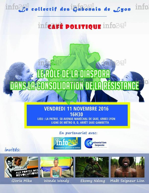 C’est dans ce sens, que le collectif des gabonais de Lyon l’emboîte le pas en conviant dans la ville des lumières lyonnaises tous les gabonais, africains, amis du Gabon épris des valeurs d’alternance démocratique, d’état de droit et du respect de la souveraineté nationale à un « Café Politique » qu’il organise ce vendredi 11 novembre 2016 au Restaurant Brasserie « La Patrie », sis au 58 Avenue Maréchal de Saxe, 69003 Lyon à partir de 16 heure (Metro B et D, arrêt « saxe Gambetta »).