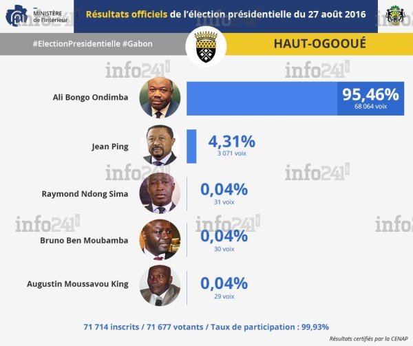 Le Gabon n’a jamais été autant au bord de l’implosion. Jamais une élection présidentielle n’aura autant été contestée. Ali Bongo, candidat malheureux à la présidentielle du 27 août qui digère mal sa défaite à cette élection voulue à un tour, a fait du Haut-Ogooué son rempart électoral pour refuser de céder à la volonté du Peuple qui a massivement voté pour Jean Ping. Retour sur des chiffres soviétiques dont nous envieraient même la plus grande des dictatures au monde.