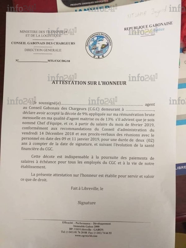 Dans un contexte économique difficile où même l’Etat ne pourvoit que difficilement à ses engagements, le CGC établissement public ayant compétence dans le fret maritime commercial, tente de se prémunir contre la précarité financière qui le côtoie. C’est en partie ce que pourrait illustrer l’engagement sur l’honneur que tente d’arracher la direction générale à ses agents.