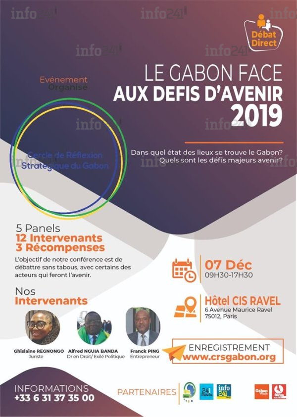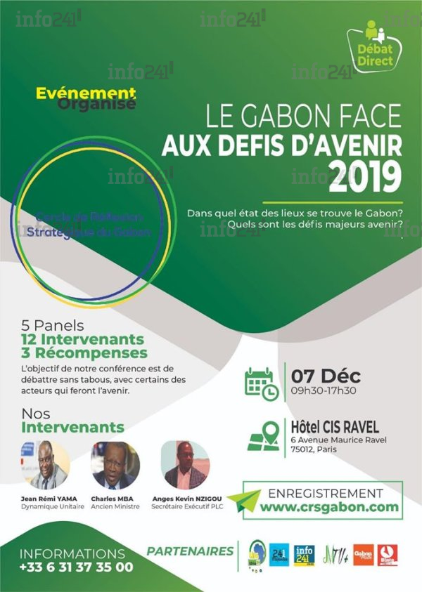 Le Cercle de réflexion stratégique du Gabon (CRSG), think-tank coordonné par Jamel Nkebassani, organisera un conclave avec pour thème : « Le Gabon Face aux Défis d’Avenir », samedi 7 décembre 2019 à Paris (France). En partenariat avec Info241 du groupe Binto Média. Plusieurs personnalités publiques prendront part aux panels de discussion lors de cet événement, entre autre : Anges Kevin Nzigou (avocat), Désiré Ename (journaliste), Ghislaine Regnongo (juriste), Charles M’Ba (Président PLG, ancien ministre), Franck Ping (entrepreneur), Laurence Ndong (universitaire, Vp PLG), Alfred Nguia Banda (Dr en droit, exilé politique) Jean Rémy Yama et Marc Ona (société civile).