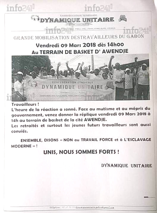 Rappelons que le mercredi 28 février, la Dynamique unitaire, qui regroupe plusieurs syndicats des administrations publiques du Gabon, avait décidé, au cours d’une assemblée générale à Libreville, de déposer le lendemain un préavis de grève sur la table du Premier ministre et du ministre de la Fonction publique, pour contester certaines mesures prises en conseil des ministres, notamment le paiement au 30ème, l’avancement automatique au mérite pour ne citer que celles-là.