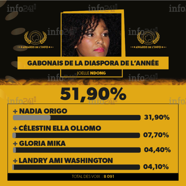 Le prix du Gabonais de la diaspora a permis le sacre de la journaliste Joëlle Ndong qui a recueilli 4 199 voix soit 51,90% devant Nadia Origo (2e avec 31,90%), Célestin Ella Ollomo (3e avec 7,70%), Gloria Mika (4e avec 4,40%) et Landry Ami Washington (5e avec 4,10%).