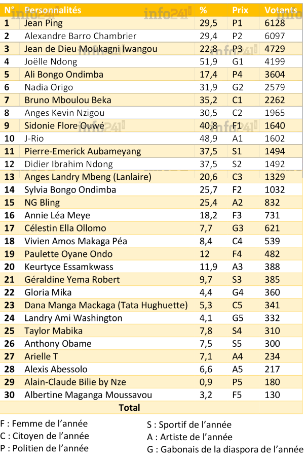 Ainsi dans la catégorie « homme politique » de l’année, la victoire est revenue à Jean Ping qui a recueilli 6 128 voix soit 29,50% suivi d’Alexandre Barro Chambrier (2e avec 29,4%), Jean de Dieu Moukagni Iwangou (3e avec 22,8%), Ali Bongo (4e avec 17,4%) et Alain-Claude Bilie by Nze (5e avec 0,9%). Cette catégorie est celle ayant reçu le plus de suffrages des internautes participant à cette votation en ligne.