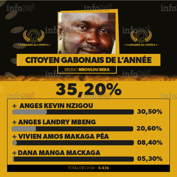 Le prix du Citoyen gabonais de l’année a consacré à titre posthume Bruno Mboulou Beka qui a recueilli 2 262 voix soit 35,20% devant Anges Kevin Nzigou (2e avec 30,50%), Anges Landry Mbeng alias Lanlaire (3e avec 20,60%), Vivien Amos Makaga Péa (4e avec 8,40%) et Dana Manga Mackaga alias Tata Hughuette (5e avec 5,3%).