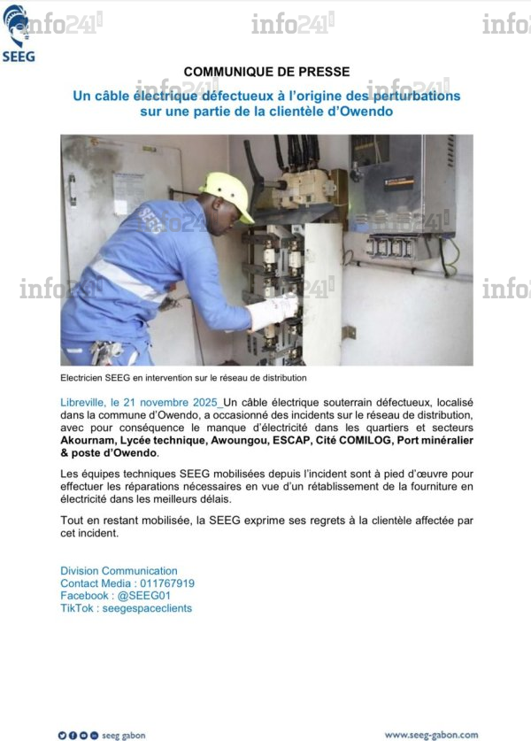 La commune d’Owendo, voisine de la capitale gabonaise, fait face depuis ce vendredi 21 novembre 2025 à une importante perturbation de l’alimentation électrique. Dans un communiqué parvenu à Info241, la Société d’énergie et d’eau du Gabon (SEEG) attribue l’incident à un câble souterrain défectueux situé dans la zone, à l’origine d’un arrêt brutal de la distribution dans plusieurs secteurs stratégiques. Une situation qui a touché aussi bien les ménages que les établissements scolaires et structures industrielles.