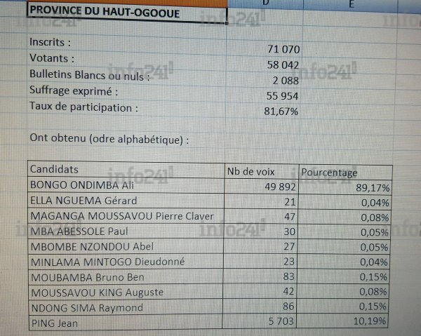 La province du Haut-Ogooué aurait eu ainsi 58.042 votants (contre 71.667 annoncés) un changement de taille qui défait considérablement les résultats officiels. Ali Bongo engrange ainsi 48.982 voix contre 5.703 pour son rival Jean Ping qui termine à 10,19% dans cette province au lieu des 4,31% que lui créditait le ministre de l’intérieur.